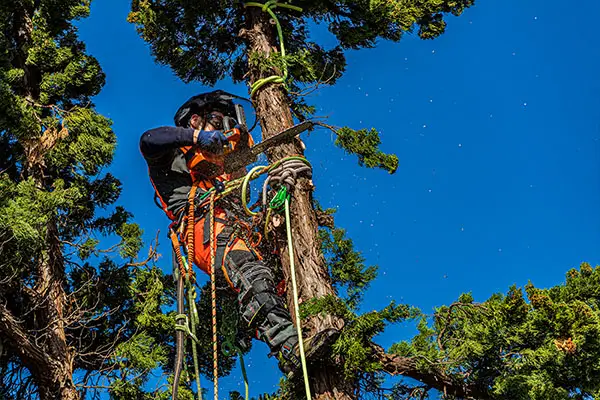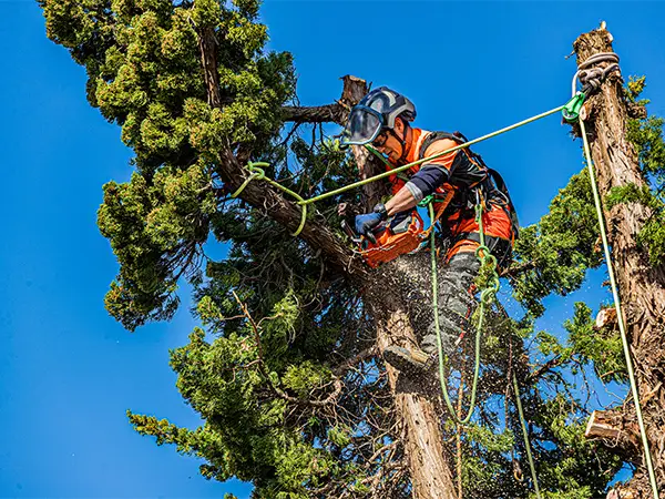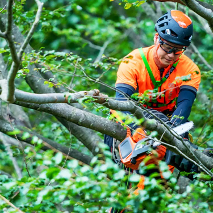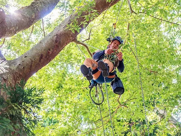 HARDWOODには、ロープを使って高木や巨木に登って伐採する「ロープワーク」の高い技術と、日本アーボリスト® 協会の研修で得た安全に伐採する技術と知識を持った「木こり」が在籍しているため、安全第一の伐採が可能です。