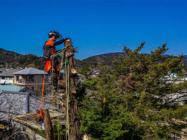 クレーンやレッカーを使わず、ロープを使って高木や巨木に登って伐採する「ロープワーク」の高い技術があるため、狭い敷地内でも安全に伐採いたします。