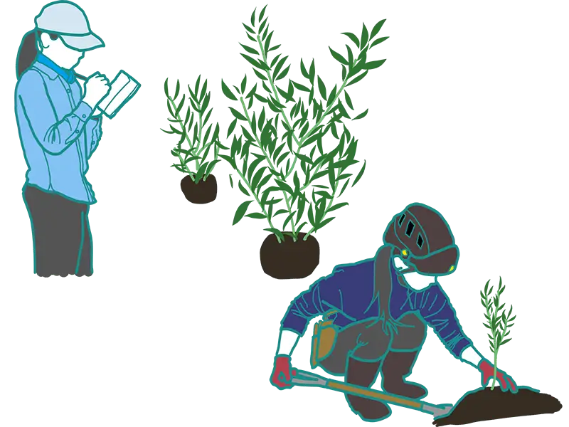 樹木の医者である「樹木医」が、植物が成長した5年後・10年後を見据えて、緑の空間の設計図を作成。